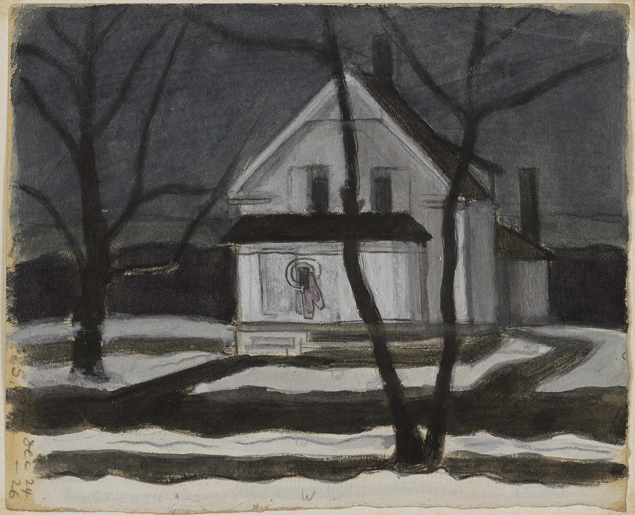 In 1926, Bluemner’s wife Lina died suddenly, and this tragic event prompted him to move with his children to South Braintree, Massachusetts. There, at the age of fifty-nine, the artist entered the final and most prolific phase of his career during which he explored male and female principles, attempted to identify the various dimensions of experience (the physical, the emotional/intellectual/ and the spiritual), and searched for transcendental truths revealed through the senses and the psyche. These late works are among the artist’s most complex. Snow, December, painted the year the artist’s wife died, evokes a cold bleakness in its palette of white and black, contrasted against a midnight blue sky.